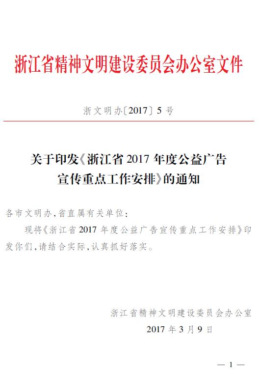 浙文明办〔2017〕5号关于印发《浙江省2017年度公益广告宣传重点工作安排》的通知