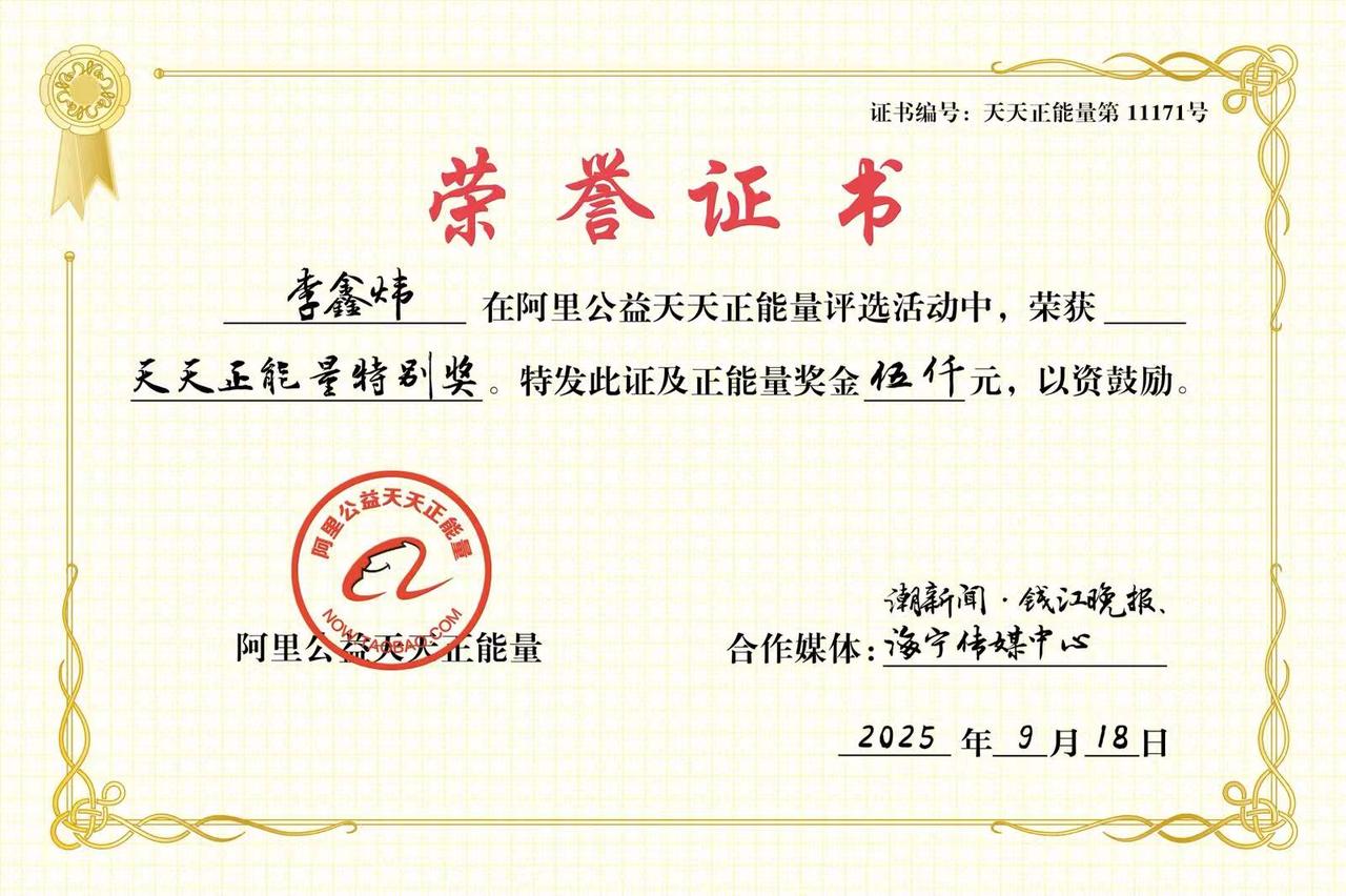 为此,阿里公益天天正能量联合潮新闻·钱江晚报,决定为李鑫炜颁发天天正能量特别奖,并奖励5000元奖金。