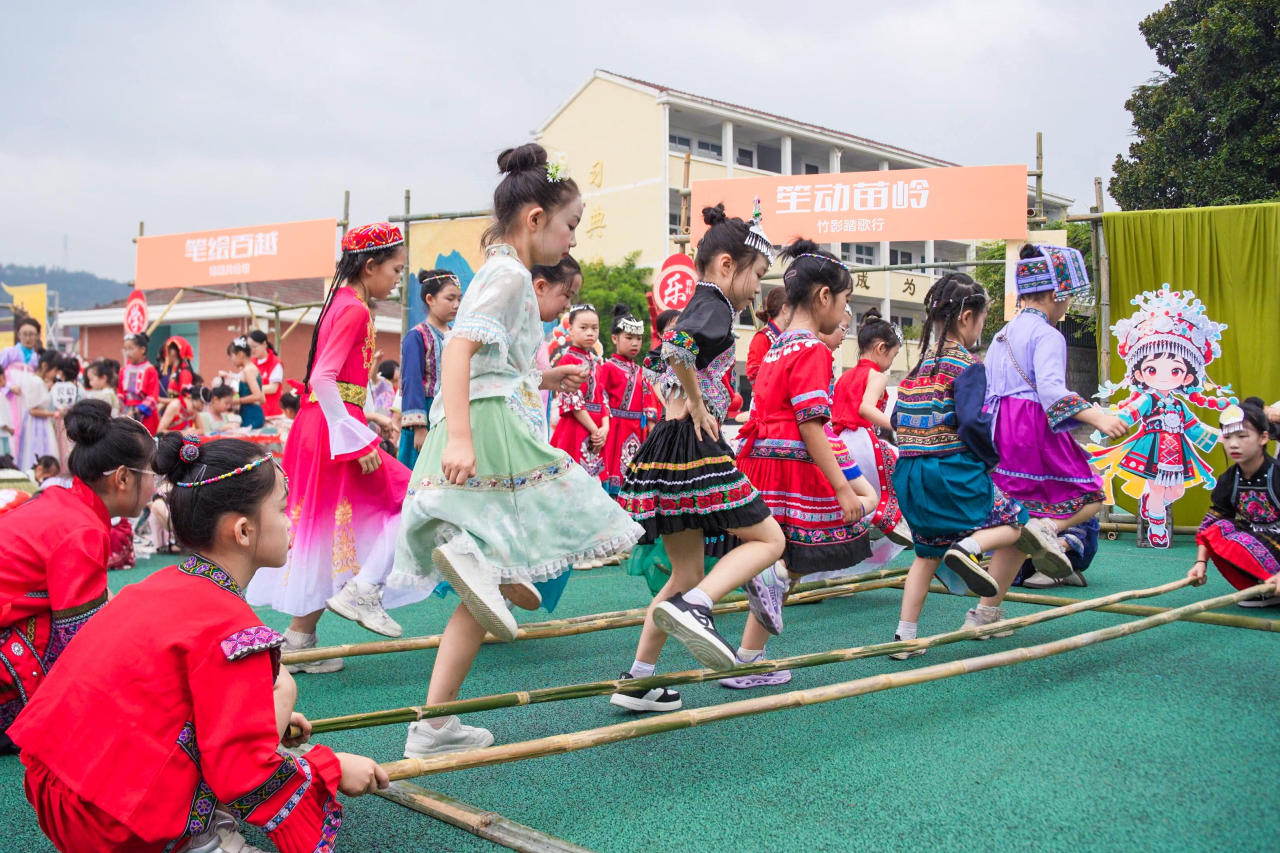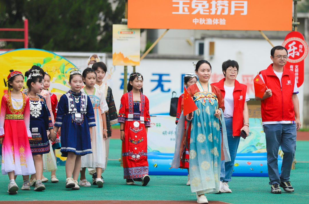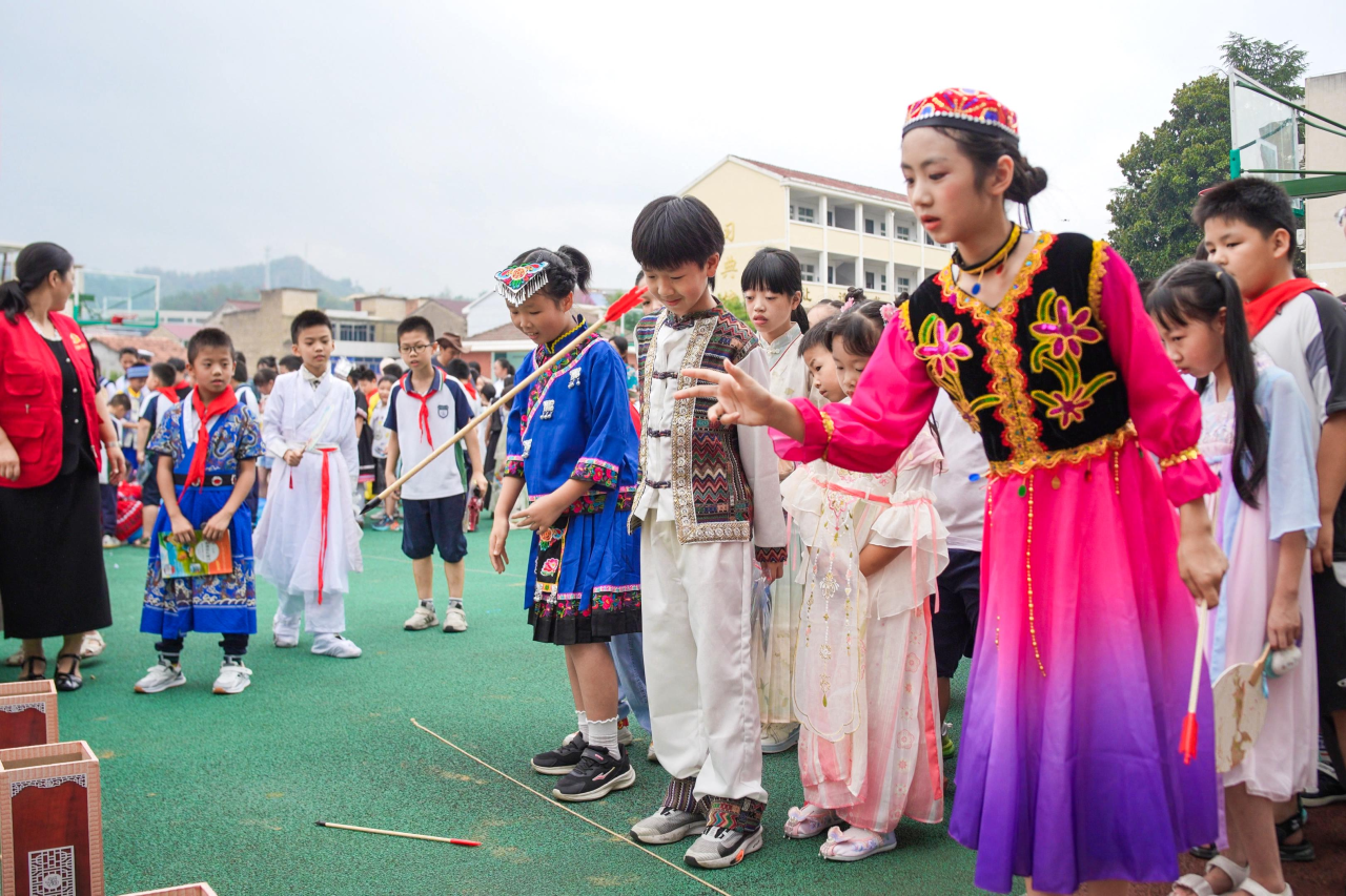 “乐有礼”体验区也同样热闹非凡,“汉风雅投?礼乐竞技场”的投壶游戏、“高山飞球?背篓接月忙”的投球游戏、“玉兔捞月?中秋渔体验”的捞金鱼乐趣,还有“笙动苗岭?竹影踏歌行”的苗族竹竿舞教学,让孩子们在欢声笑语中感受民族风情。