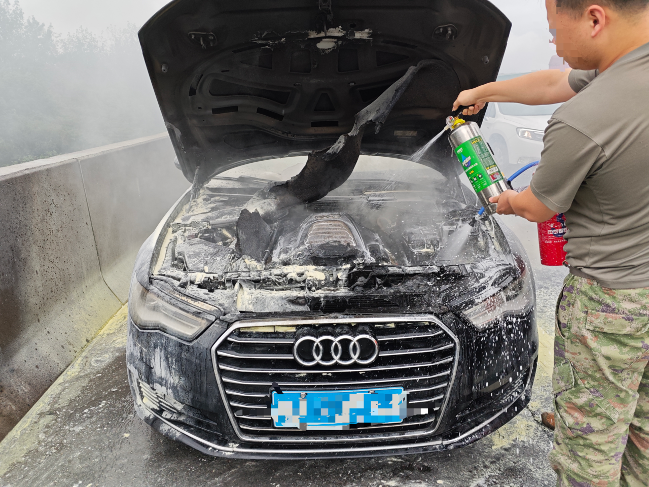 9月24日7时29分许,杭州公安高速交警一大队视频巡查发现,G56杭瑞高速杭州方向,一辆黑色轿车“拖着”一团火焰紧急??坑猜芳纾鹈缪杆俅芰顺隼?。