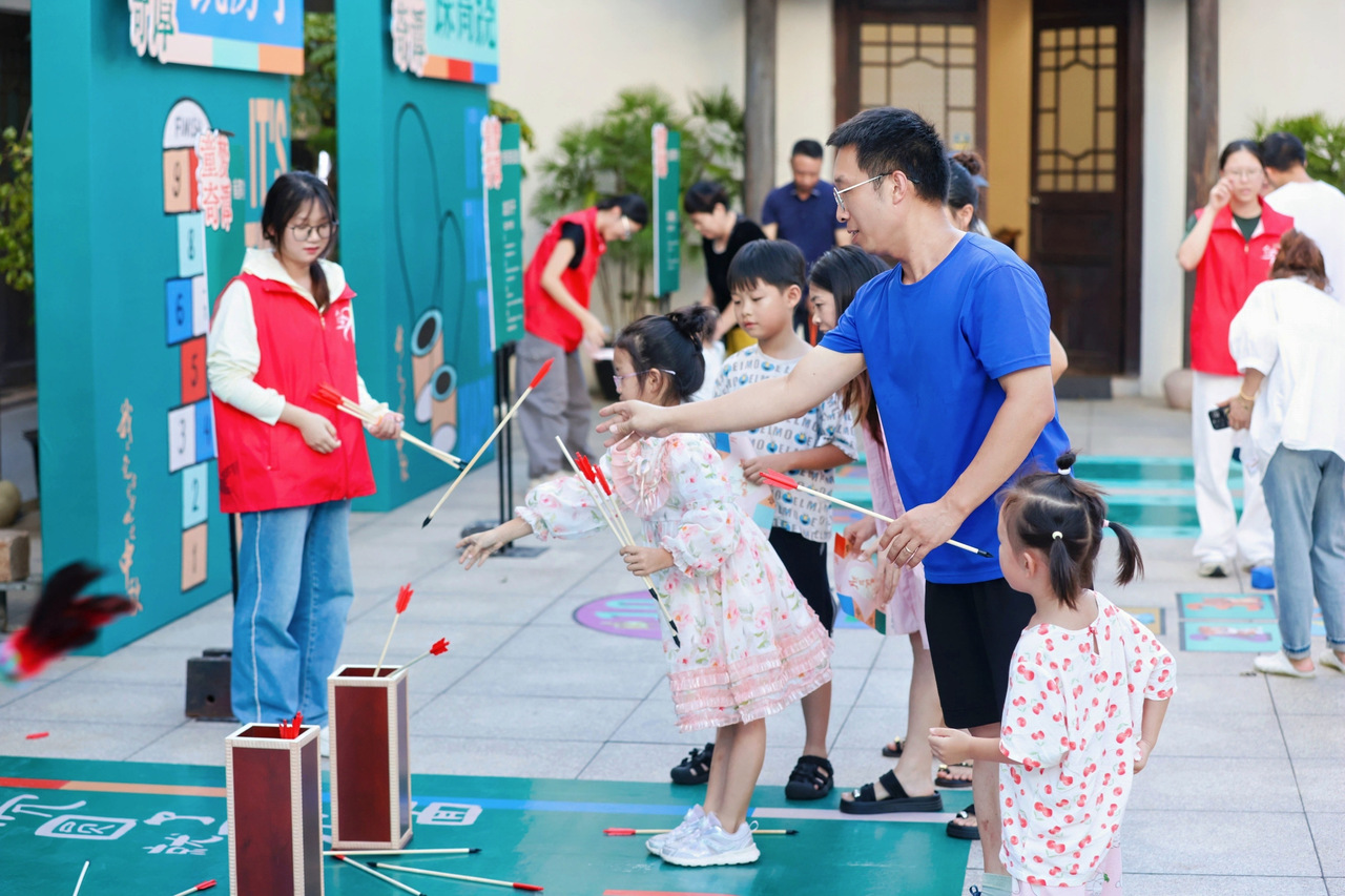 “投壶”“踢毽子”“踩高跷”等非遗游戏,让亲子家庭在互动中重拾儿时乐趣。居民手持“东南西北”折纸打卡单,集章兑换礼物,也唤醒了跨越代际的温暖记忆。传统游戏不仅是童趣的回归,更成为连接初心与传承的情感纽带,让团圆之夜因文化传承而更具深意。